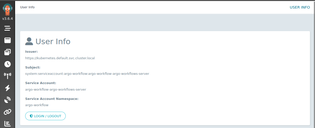 kubectl port-forward svc/argo-workflow-argo-workflows-server -n argo-workflow 2746:2746Ao acessar localhost:2746 conseguimos acessar a UI do Argo Workflow. Na aba user, podemos ver que o usuário na verdade assumiu a service account que criamos anteriormente. Mostrando que o Argo Workflow é realmente uma solução kube-native ao utilizar a própria RBAC do Kubernetes para realizar o controle de acesso a aplicação.